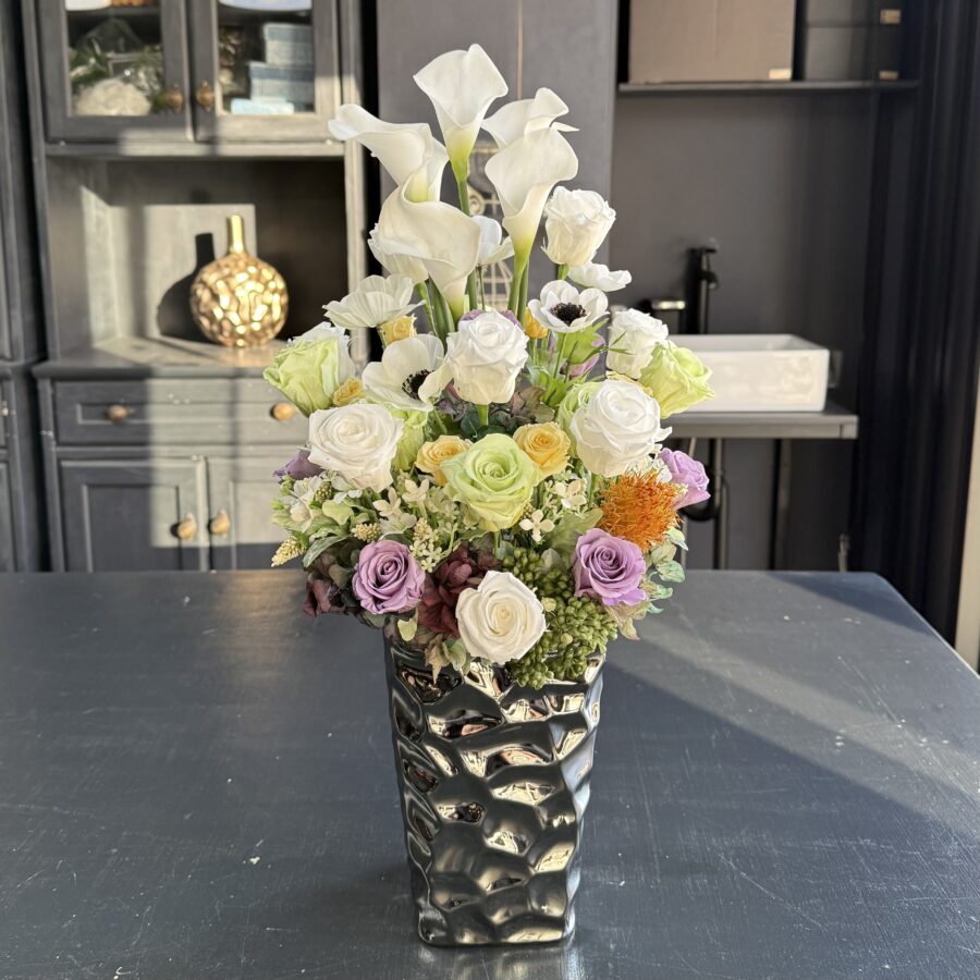お誕生日のお祝いとしてお贈りする、高さのあるプリザーブドフラワーアレンジメントです。