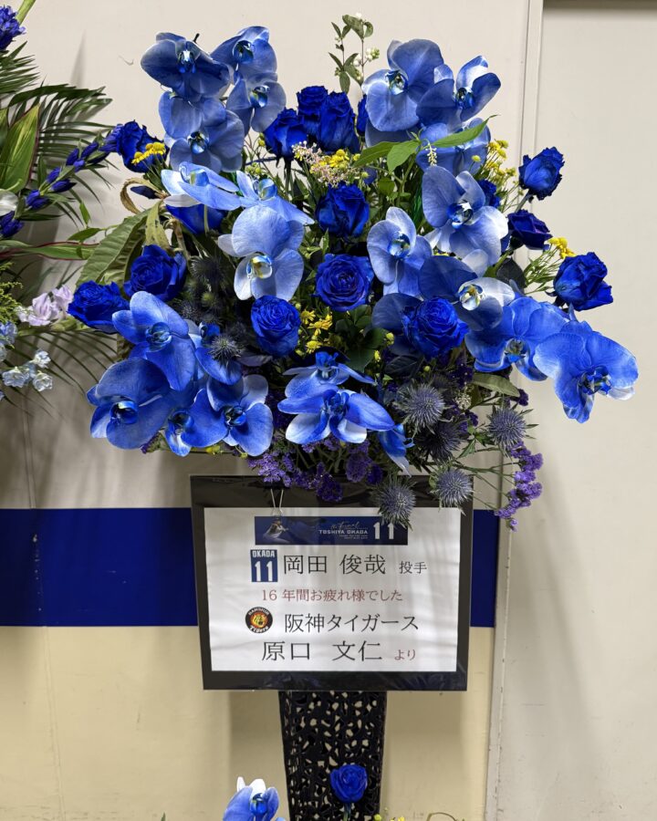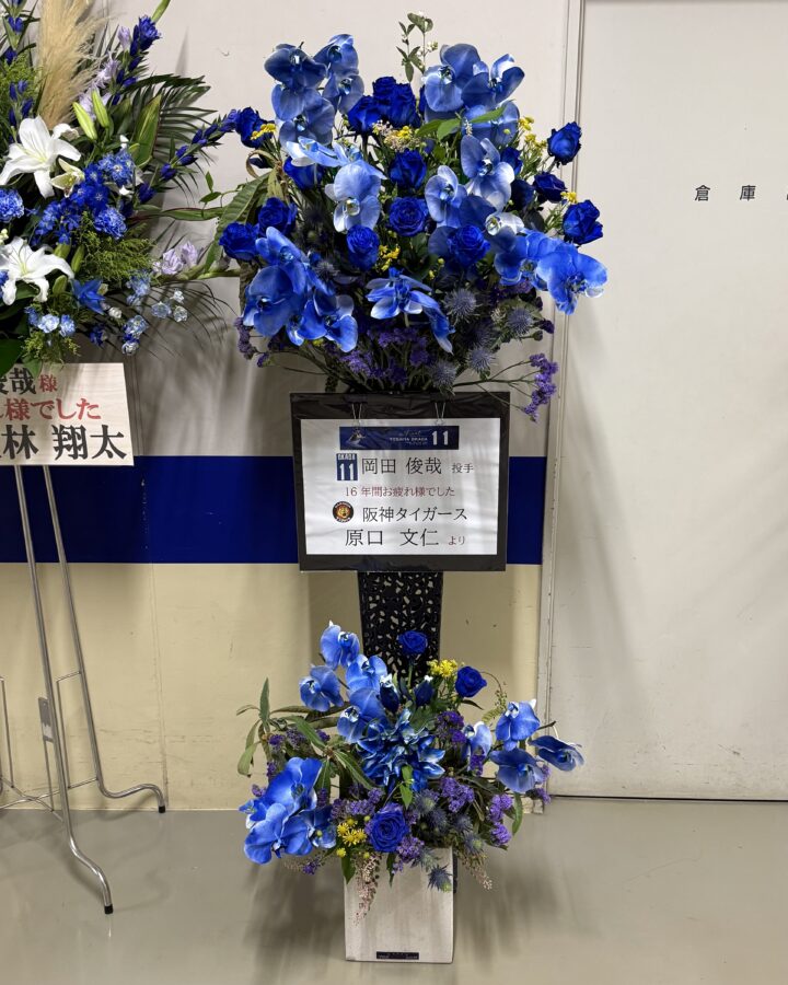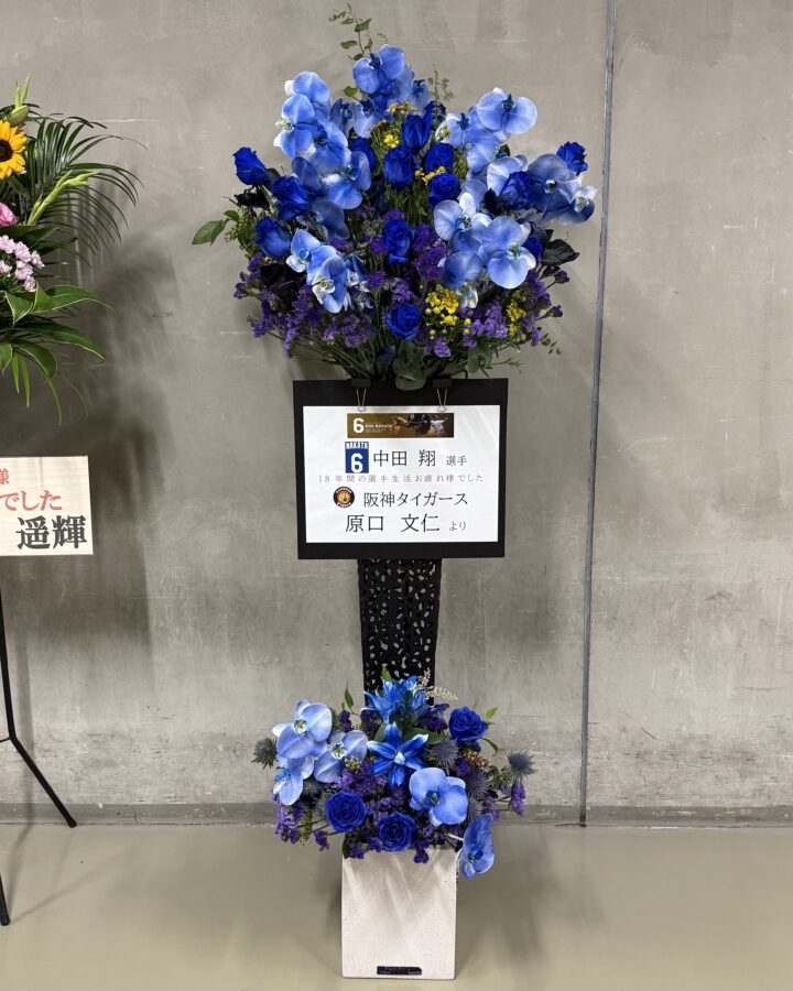 9月19日(金)東京ヤクルトスワローズ戦で今シーズン限りでの引退を表明された中田翔選手の引退セレモニーに合わせ、阪神タイガースの原口文仁さまより贈られるフラワースタンド。